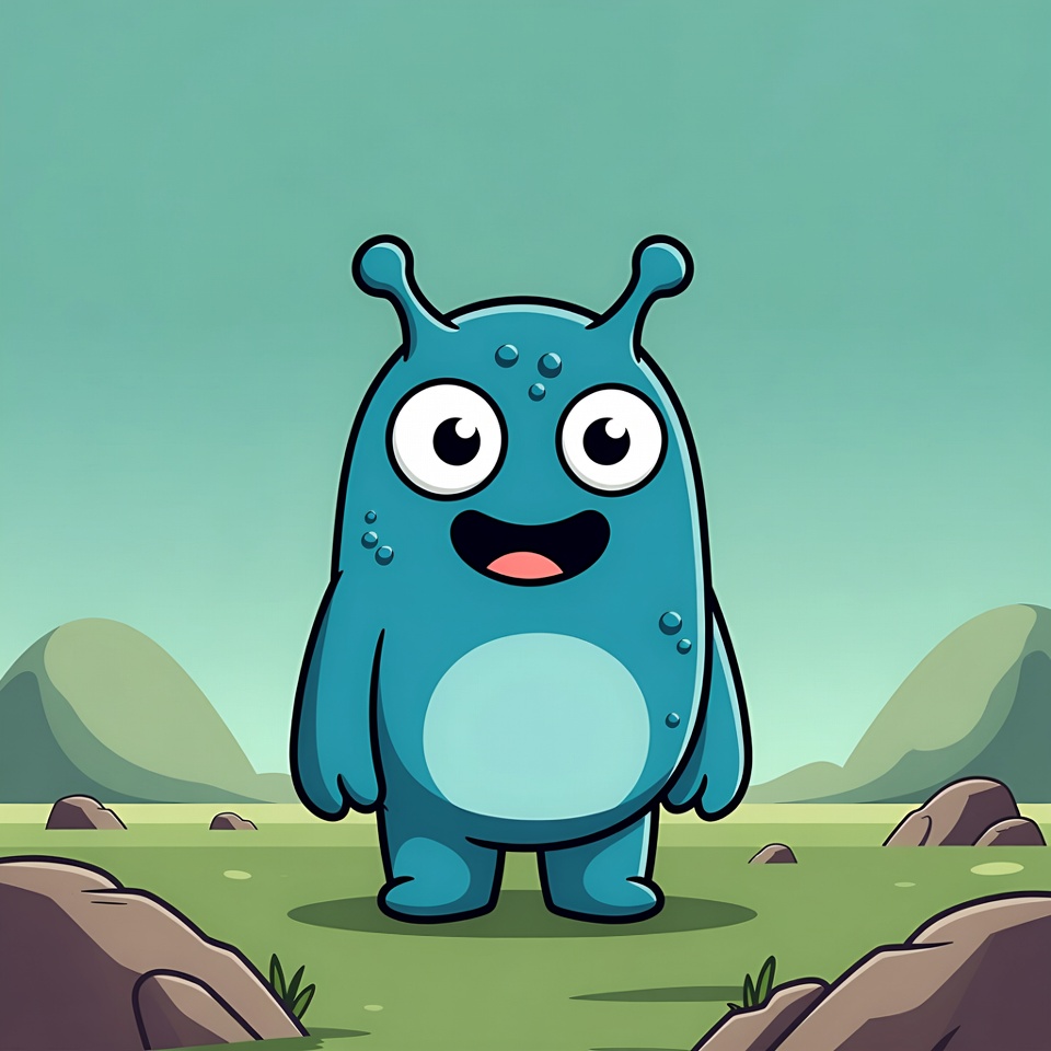 animation, artwork, blue, cartoon character, creature, cute, design, fun, grass, happy, hills, kids, landscape, nature, outdoor, playful, rocks, simple, smiling, standing