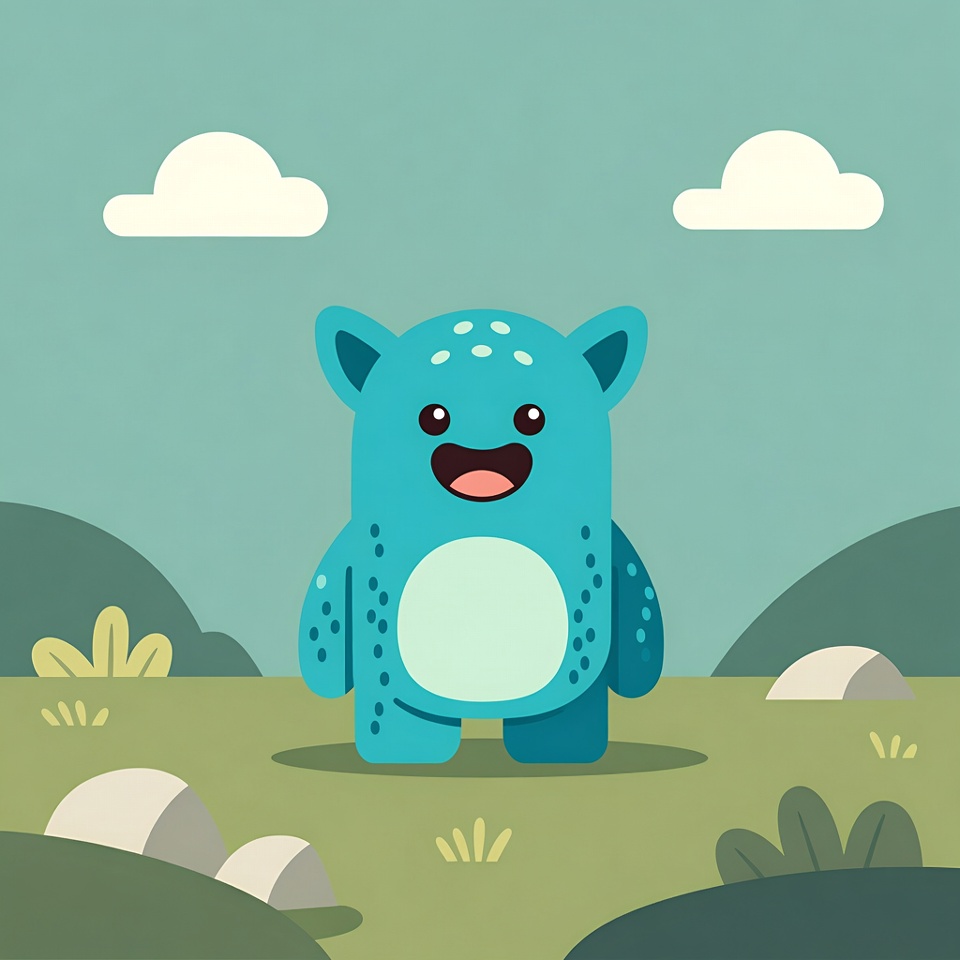 animation, blue creature, cartoon, character, clouds, cute, design, drawing, fun, furry, grass, happy, hills, joyful, landscape, nature, outdoors, playful, smiling, whimsical