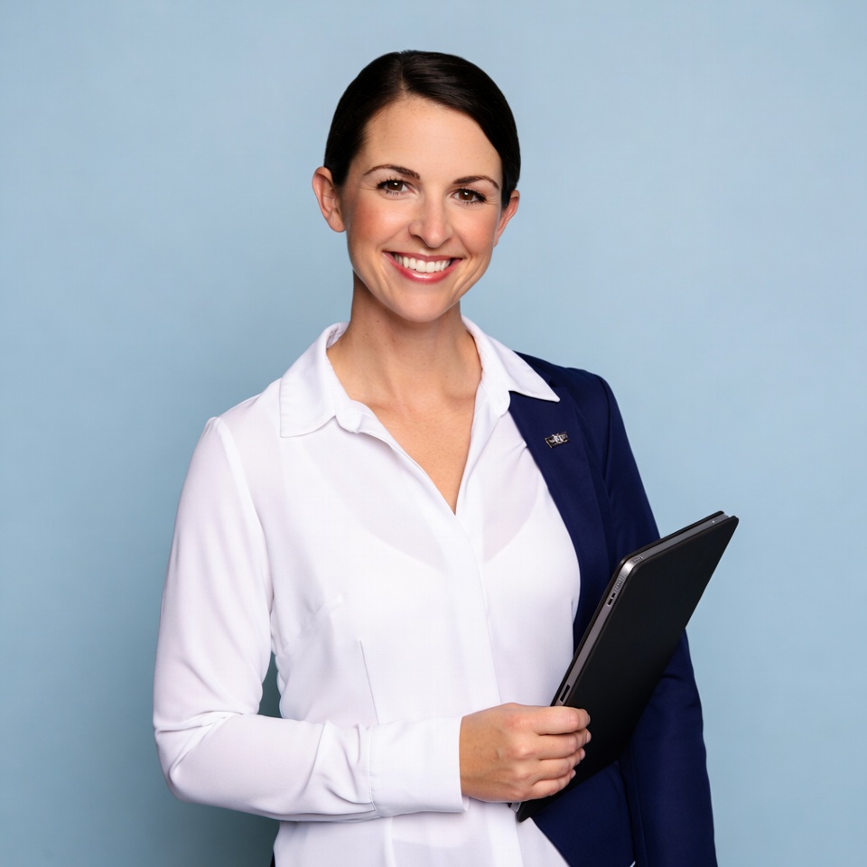 A woman stands smiling while holding a tablet. She has dark hair and wears a white shirt with a navy blazer. The background is light blue.
