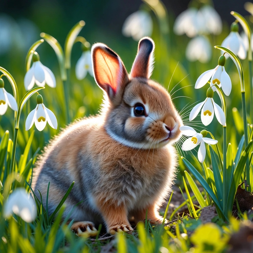 A rabbit sits among blooming snowdrop flowers. The setting shows fresh greenery and bright blossoms under natural light.