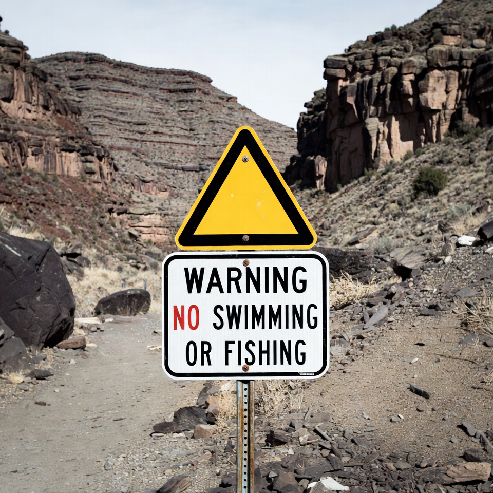 area, canyon, caution, desert, dirt path, dry, hiking, landscape, nature, no fishing, no swimming, outdoor, restrictions, rocks, rules, safety, sign, terrain, travel, warning