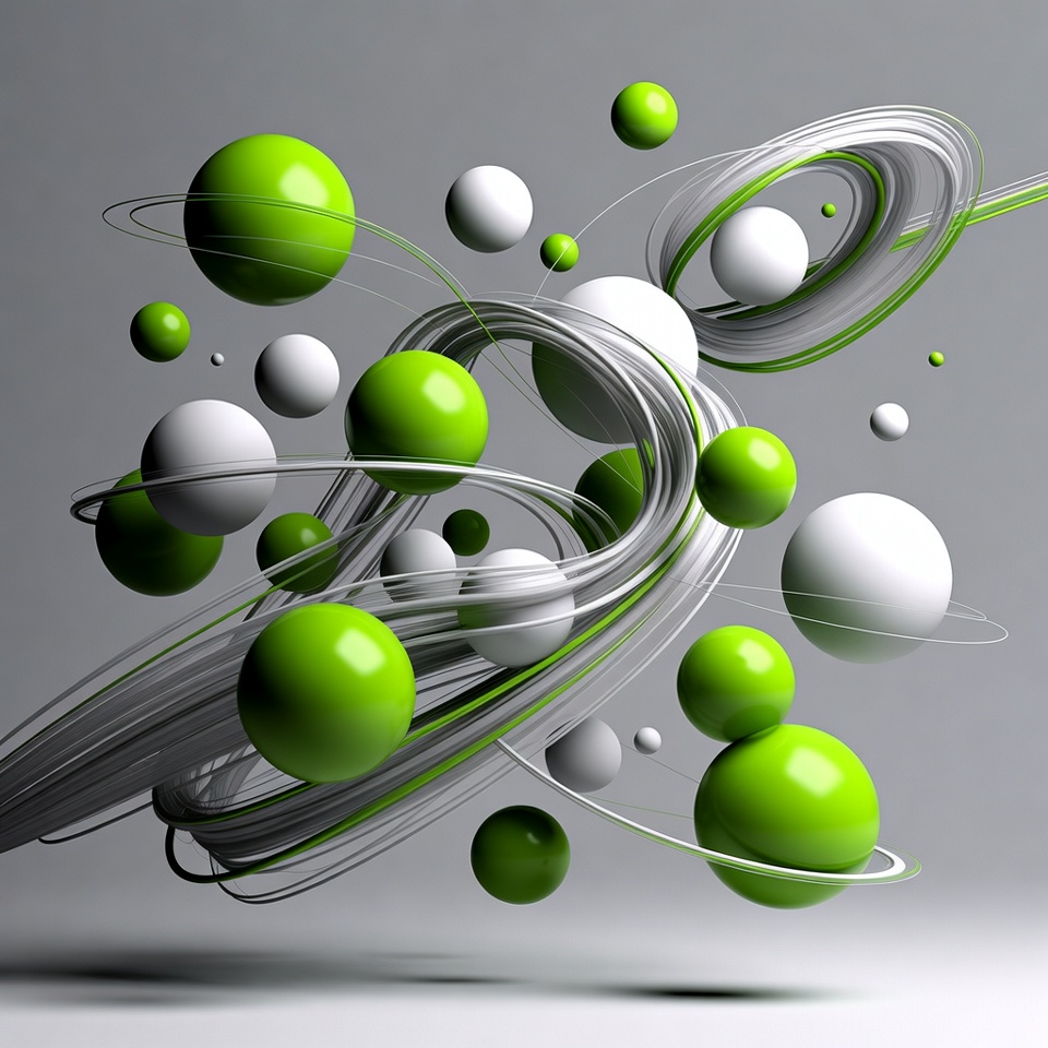 Spheres and rings of green and white float in a lifeless space, creating an abstract design that draws the eye in.
