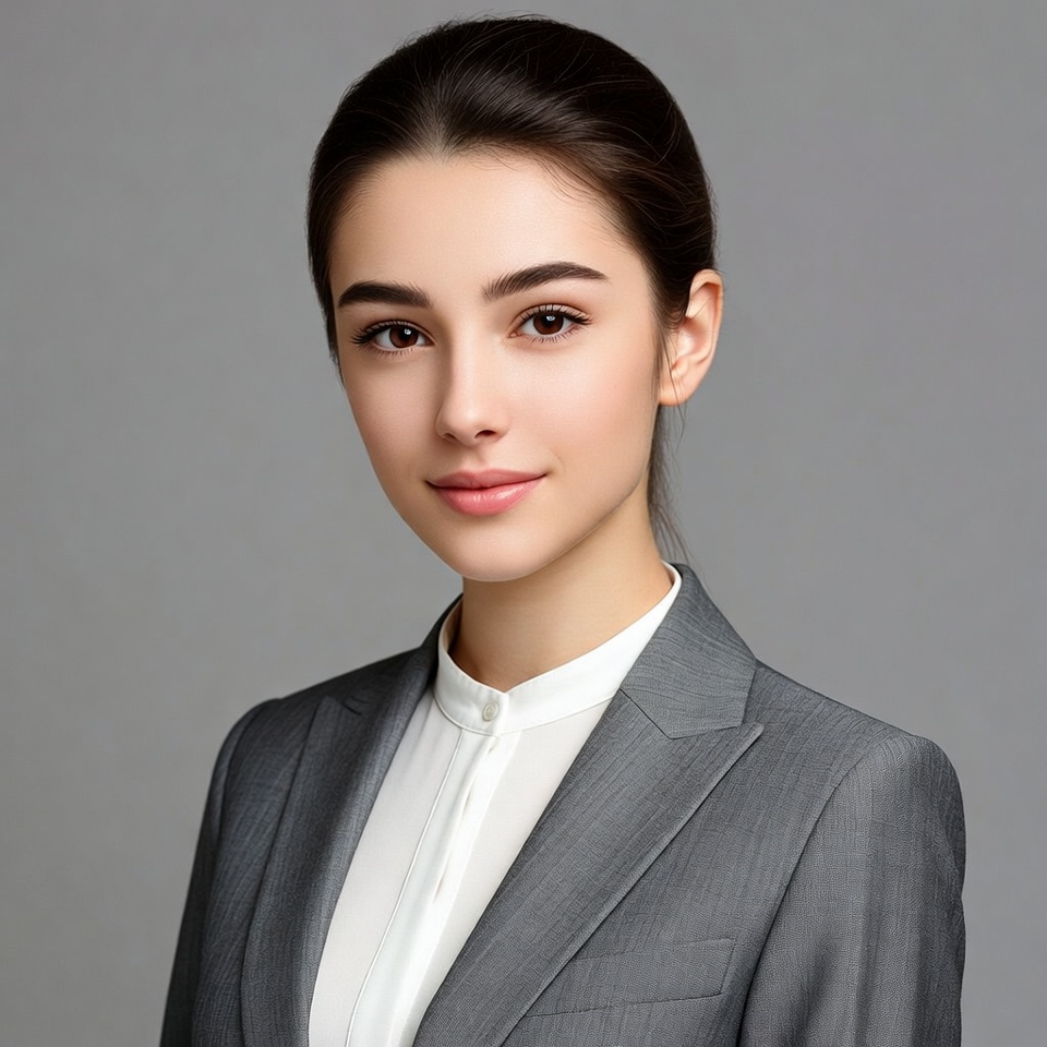 A young woman stands confidently in a gray suit, showing a neutral expression. Her hair is neatly tied back. The background is plain and light.