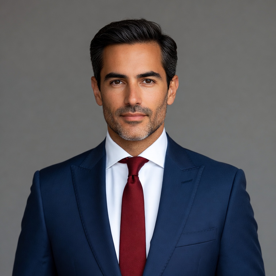 A man stands confidently wearing a dark suit and red tie. He has dark hair and a slight beard, looking directly at the viewer.