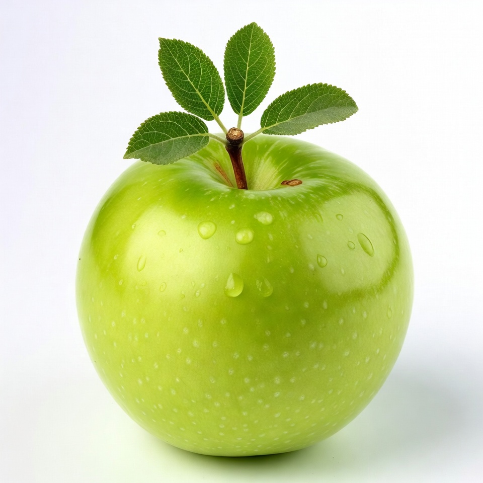 A green apple with water droplets sits on a clean white background. The apple has small leaves attached to its stem.