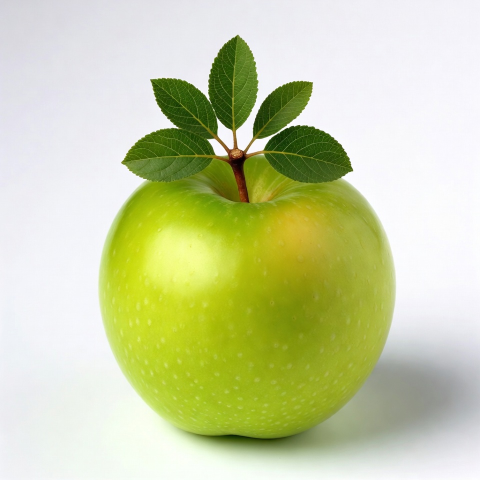A green apple sits on a clean surface, with a small branch and fresh leaves emerging from its top. The setting is simple and bright.