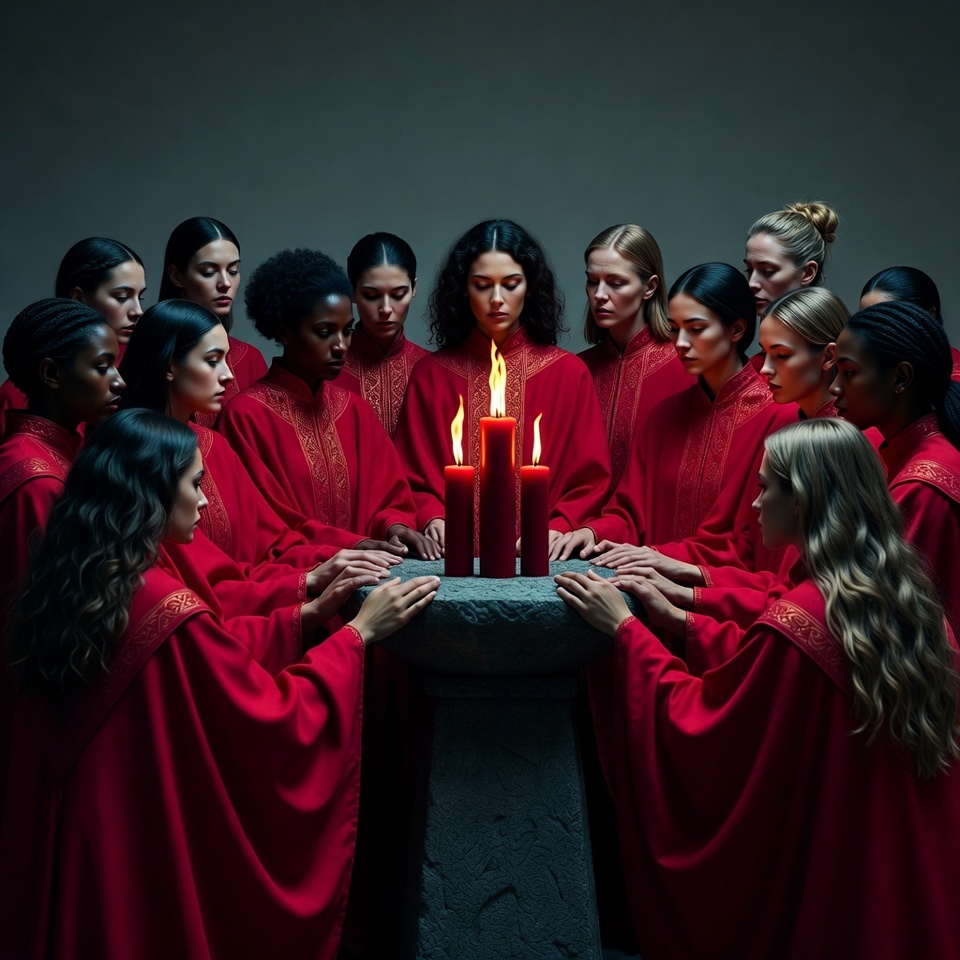 Women in red robes stand around a stone altar with lit candles. They appear focused and engaged in a shared, solemn activity.