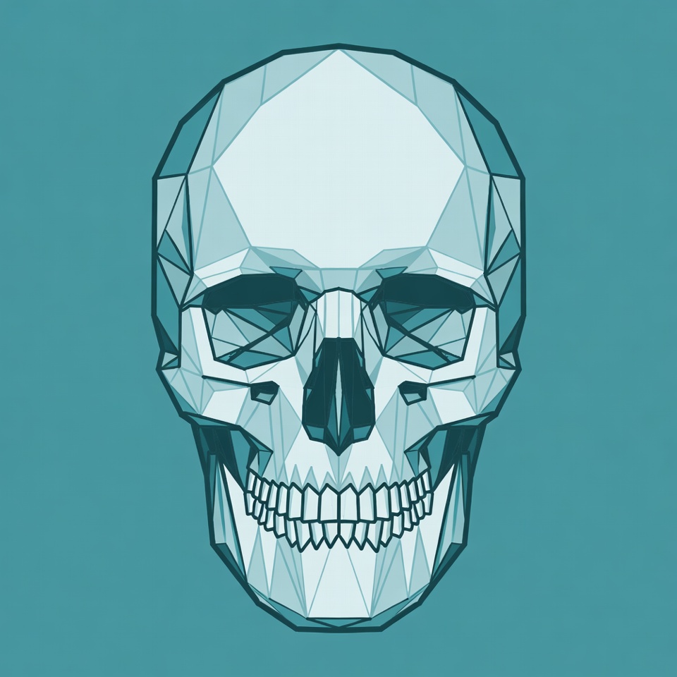 A digital skull design is displayed in a geometric style on a bright background. The focus is on the unique shapes and angles of the skull.