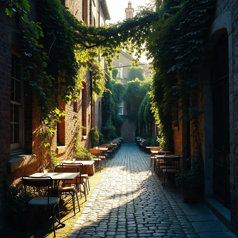 alley, architecture, bricks, cafe, chairs, cobblestone, dining, greenery, leisure, outdoor, pathway, plants, rustic, seating, street, sunlight, tables, trees, urban, vines