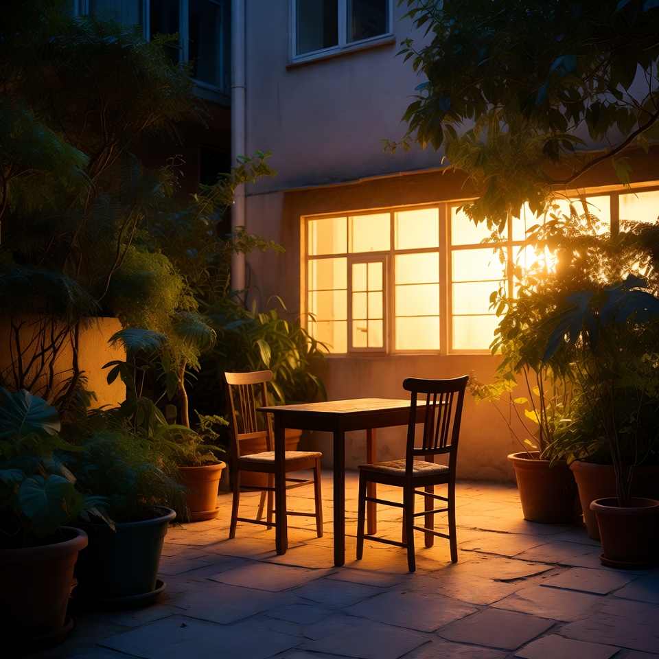 Two chairs and a table sit in a garden, lit by warm light from a nearby window. Plants surround the area, creating an inviting setting.