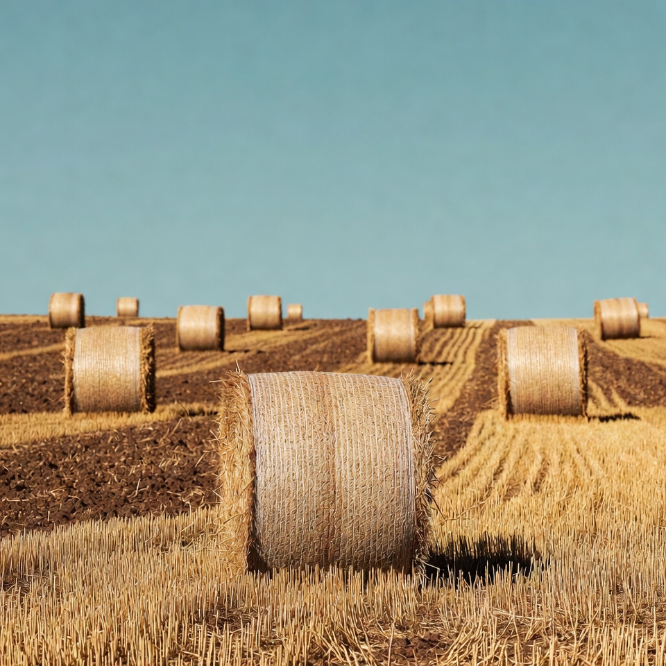 agriculture, countryside, crops, farming, field, harvest, hay bales, landscape, nature, outdoor, patterns, rural, sky, soil, straw, summer, sunny, sunshine, texture, yellow