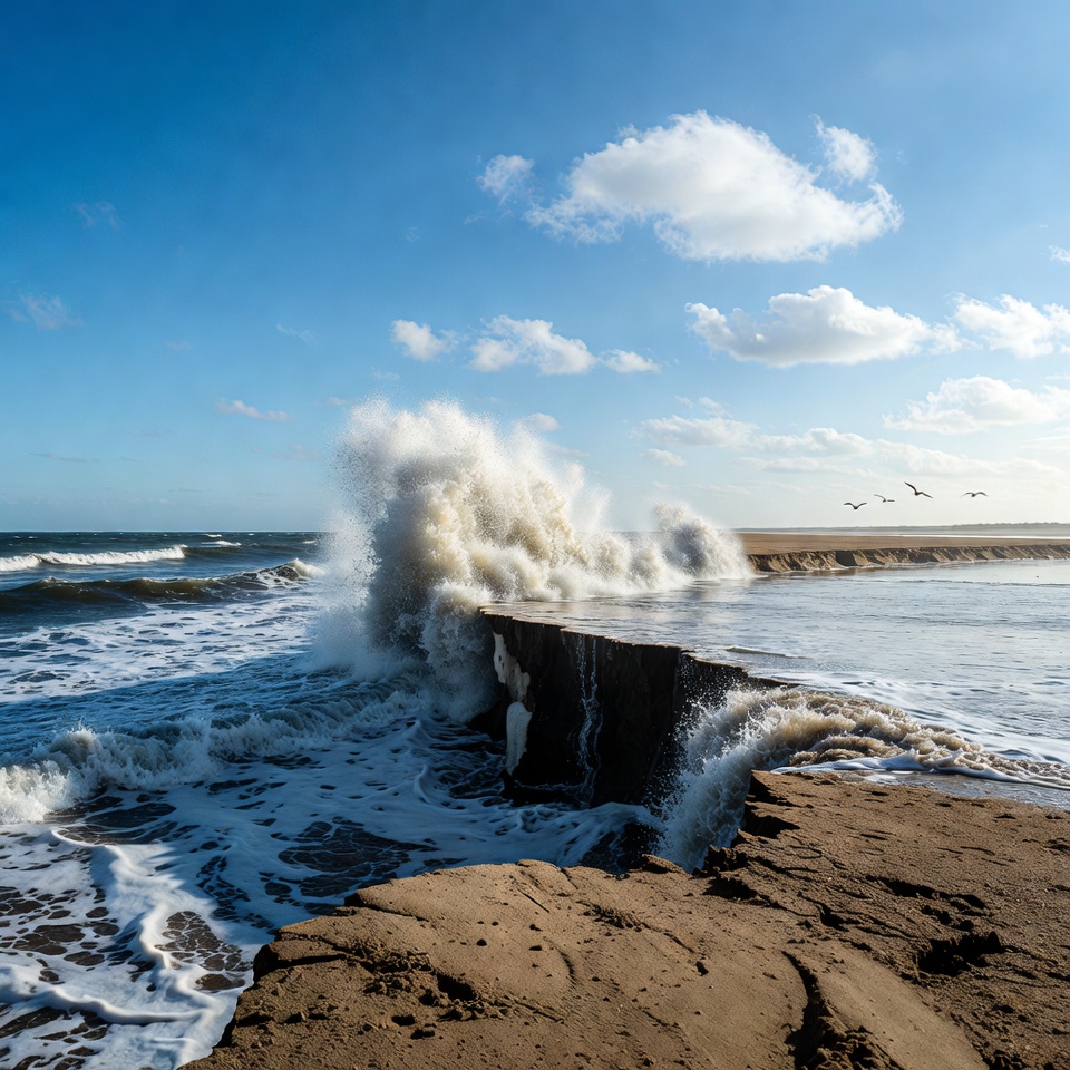 Large waves hit a sandy beach near a wooden jetty under a clear blue sky. Birds fly above the water in the background.