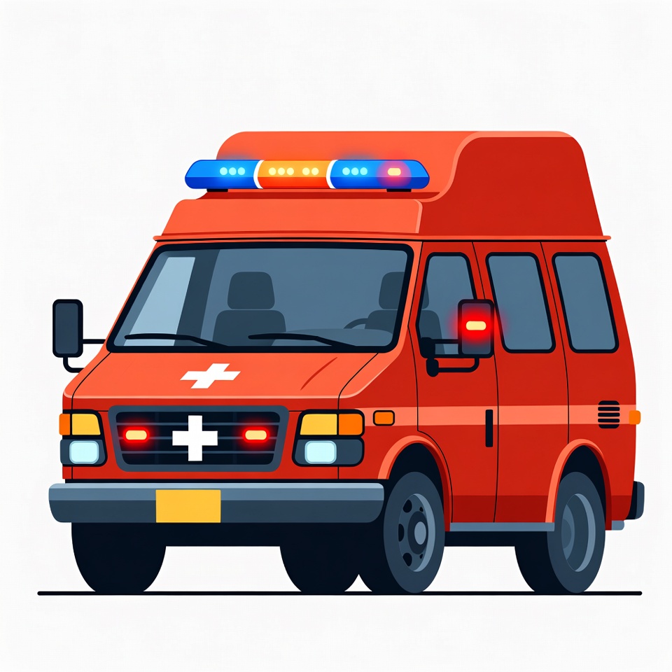 A red ambulance is parked with its emergency lights flashing. The vehicle is ready for a medical emergency response.