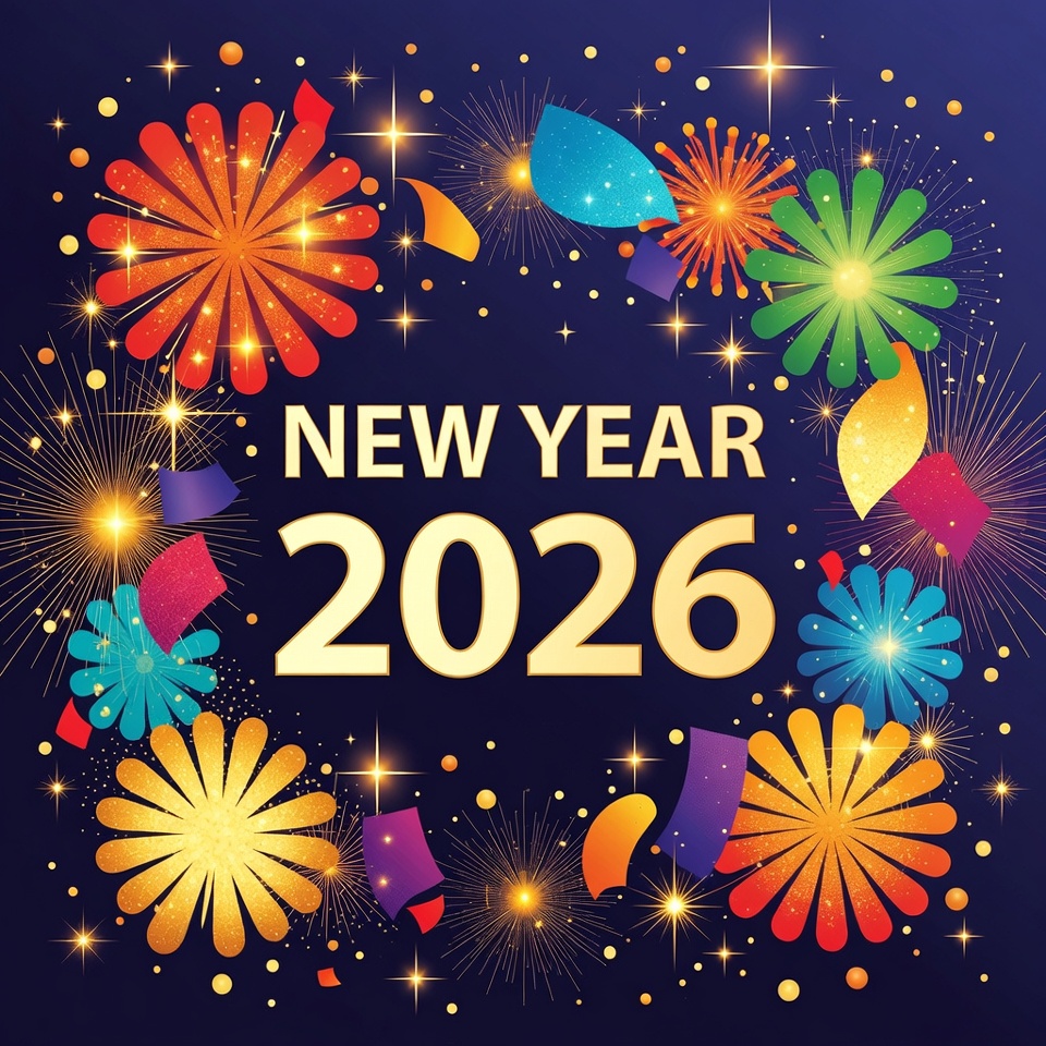 Colorful fireworks and confetti fill the background as people gather to welcome New Year 2026 with joy and excitement during the midnight countdown.