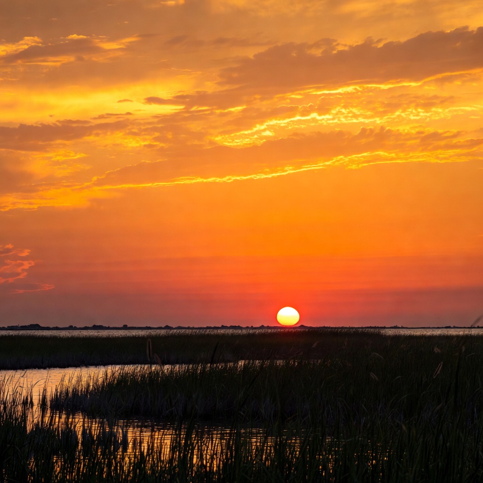 A bright orange sun sets slowly over the water at a marsh during evening time. Grass sways gently in the soft breeze.