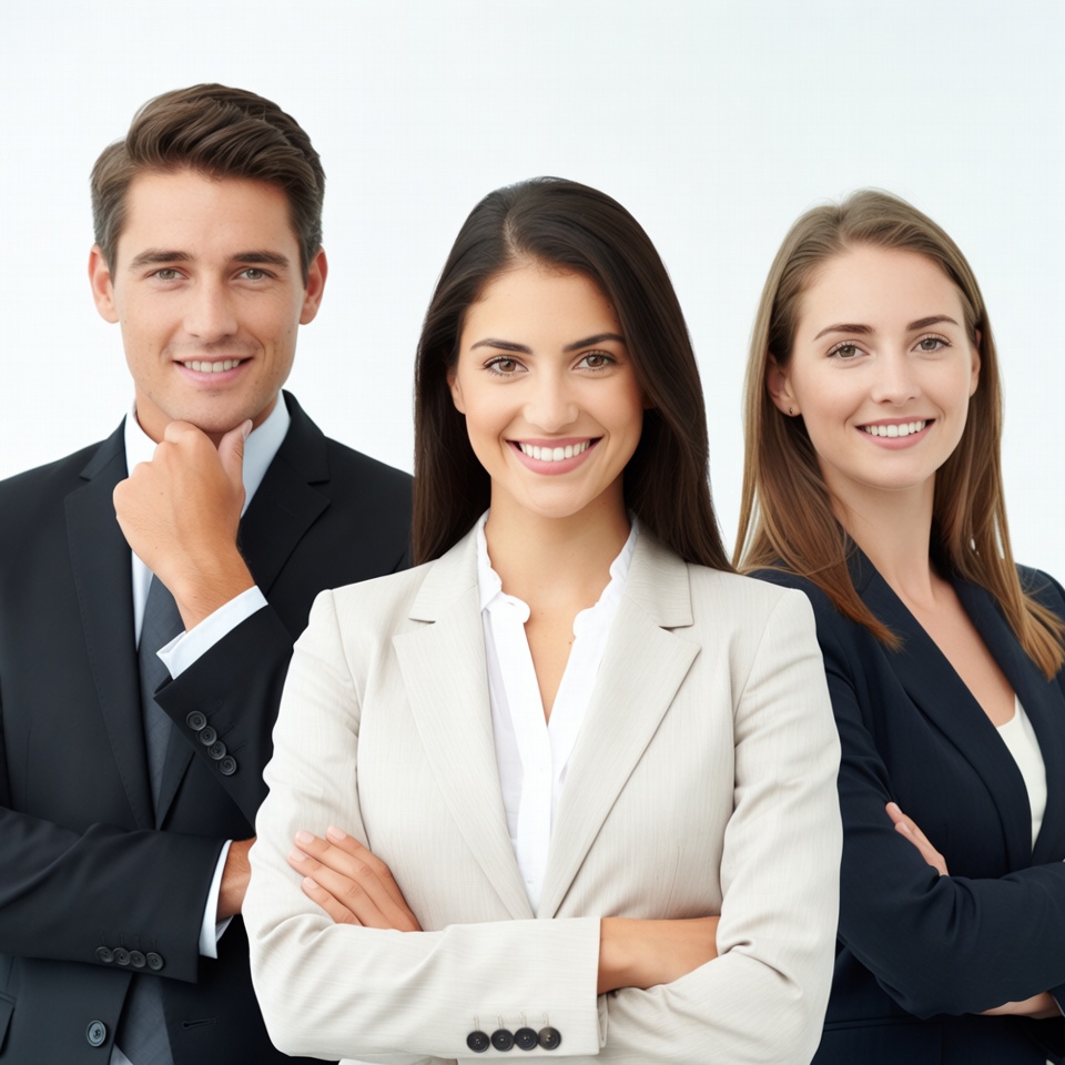 Three professionals pose together in a bright office. The individuals wear business attire and display friendly expressions.