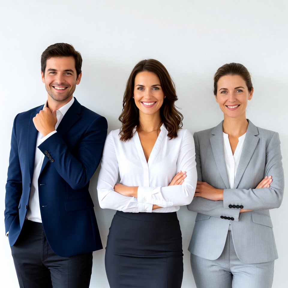 Three professionals pose in an office setting, smiling and standing confidently. They wear formal attire and display teamwork.