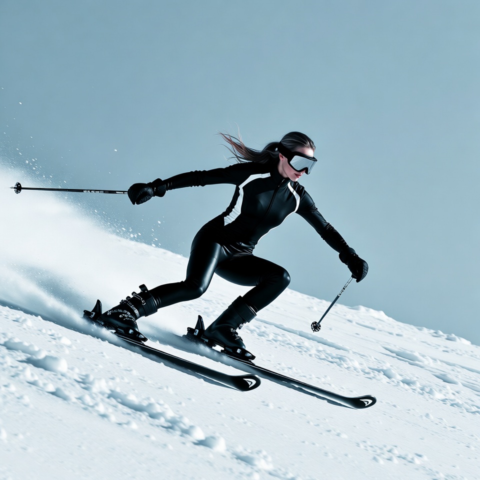 A person is skiing down a snowy slope with snow flying behind. The setting is a bright winter day, and they wear winter gear.