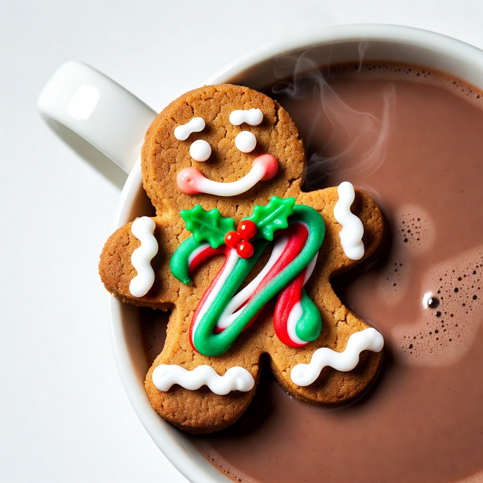 candy cane, chocolate flavor, cookie, cozy, decoration, dessert, festive, food, frosting, gingerbread, holiday, hot beverage, hot chocolate, mug, smiley face, snack, steam, sweet treat, warm drink, winter