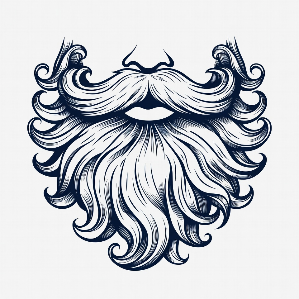 A detailed drawing shows a curly, stylized beard with a pair of lips underneath. The design features flowing lines and curves.