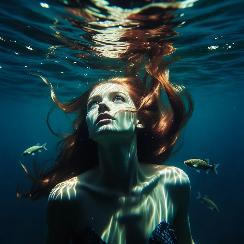 A woman swims in deep water surrounded by fish. Light reflects off her hair and skin. Bubbles rise above her as she looks upwards.