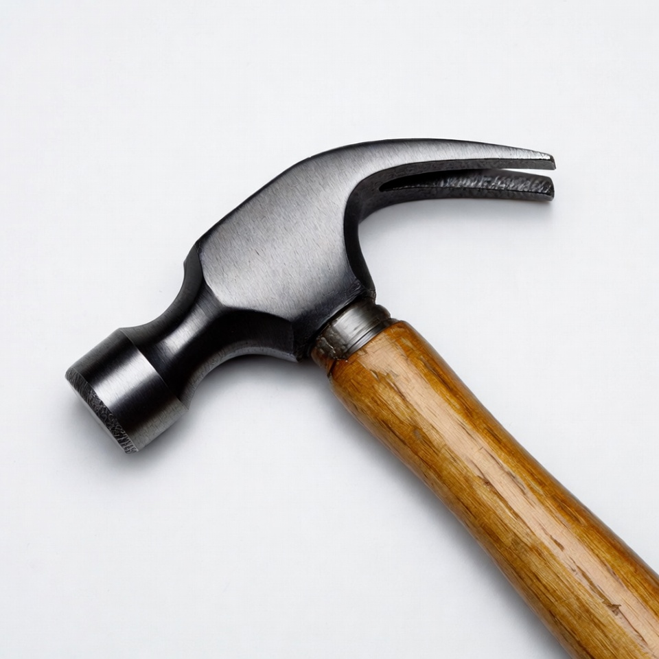 A hammer with a wooden handle lays on a white surface. It is positioned to show detail of the head and grip.