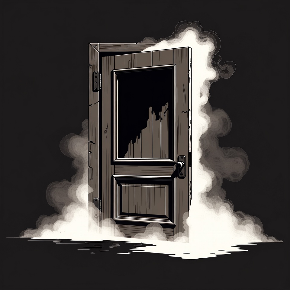 A wooden door stands alone with smoke billowing around it. The setting creates an eerie atmosphere. It sparks curiosity and wonder.