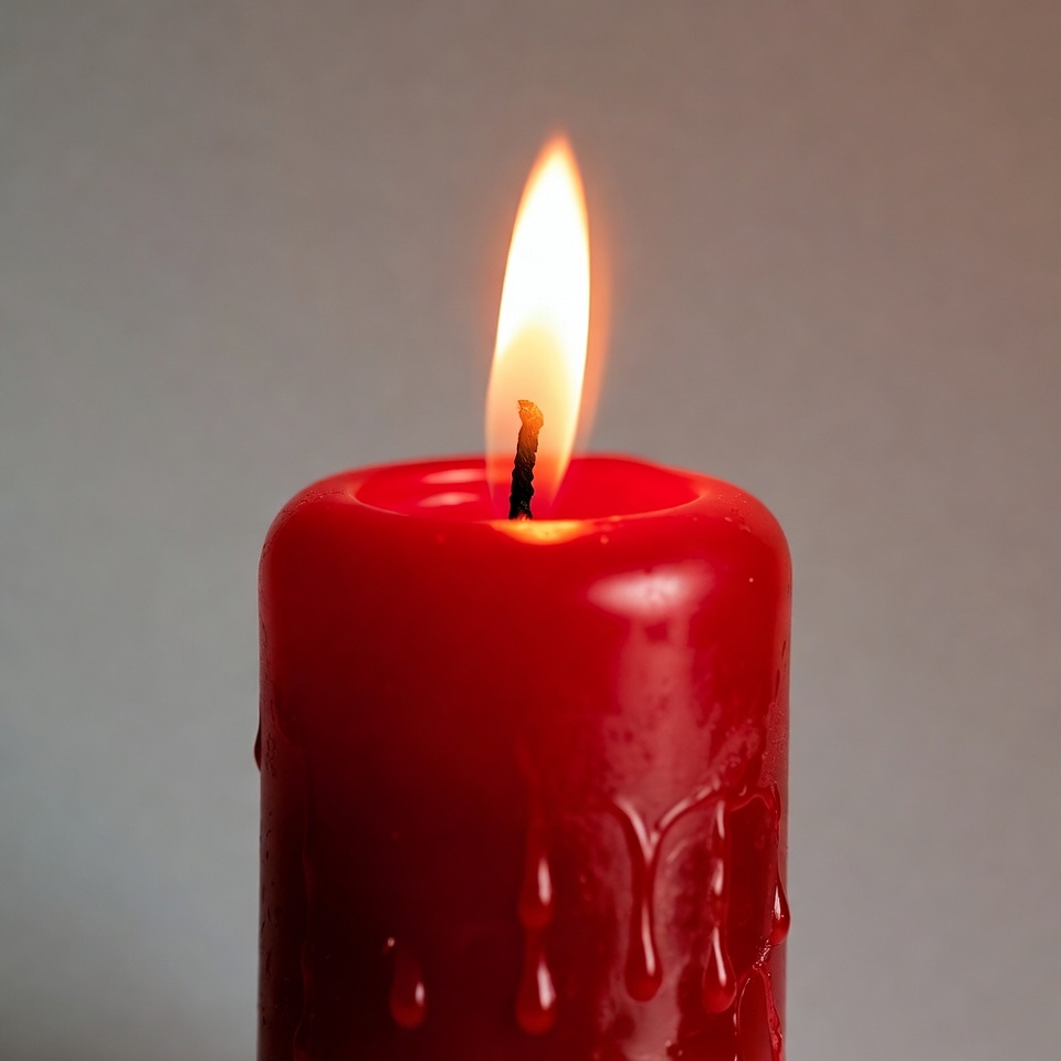 A red candle burns steadily, the flame flickering softly as wax drips down the side, creating a warm glow in the dim light.
