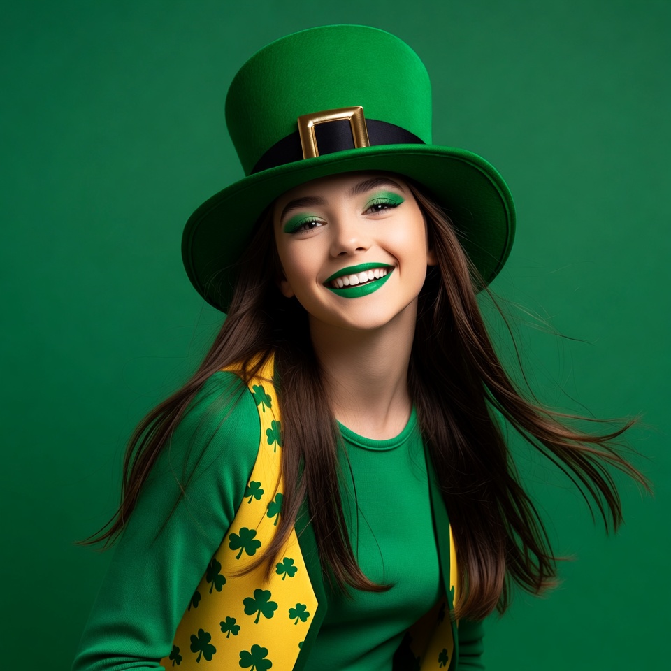 accessories, celebration, cheerful expression, clovers, community, cultural traditions, events, fashion, festive attire, festivities, fun, green makeup, green outfit, happiness, hat, holiday spirit, joy, party, smiling woman, spring