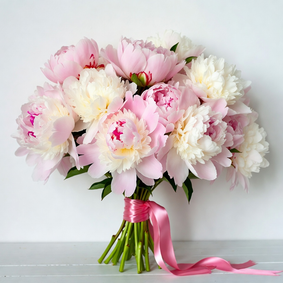 A bouquet of pink and white peonies is tied with a pink ribbon. The flowers are displayed against a plain background.