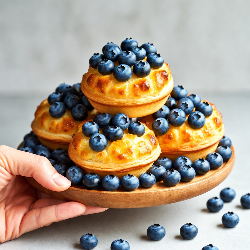 A person holds a wooden plate filled with pastries topped with fresh blueberries. Blueberries are scattered around the plate.