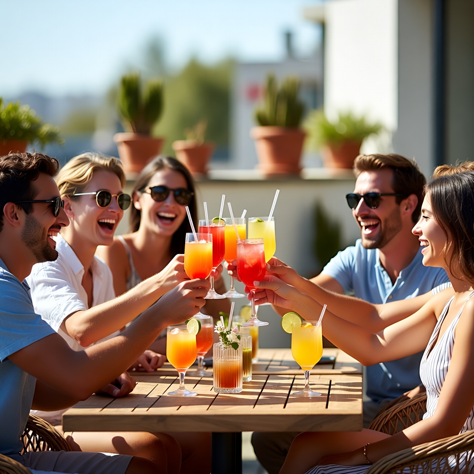 beverages, celebration, cheers, cocktails, drinks, friends, fun, gathering, good times, happiness, laughter, outdoor, roof terrace, sharing, socializing, summer, sunshine, table, toast, togetherness
