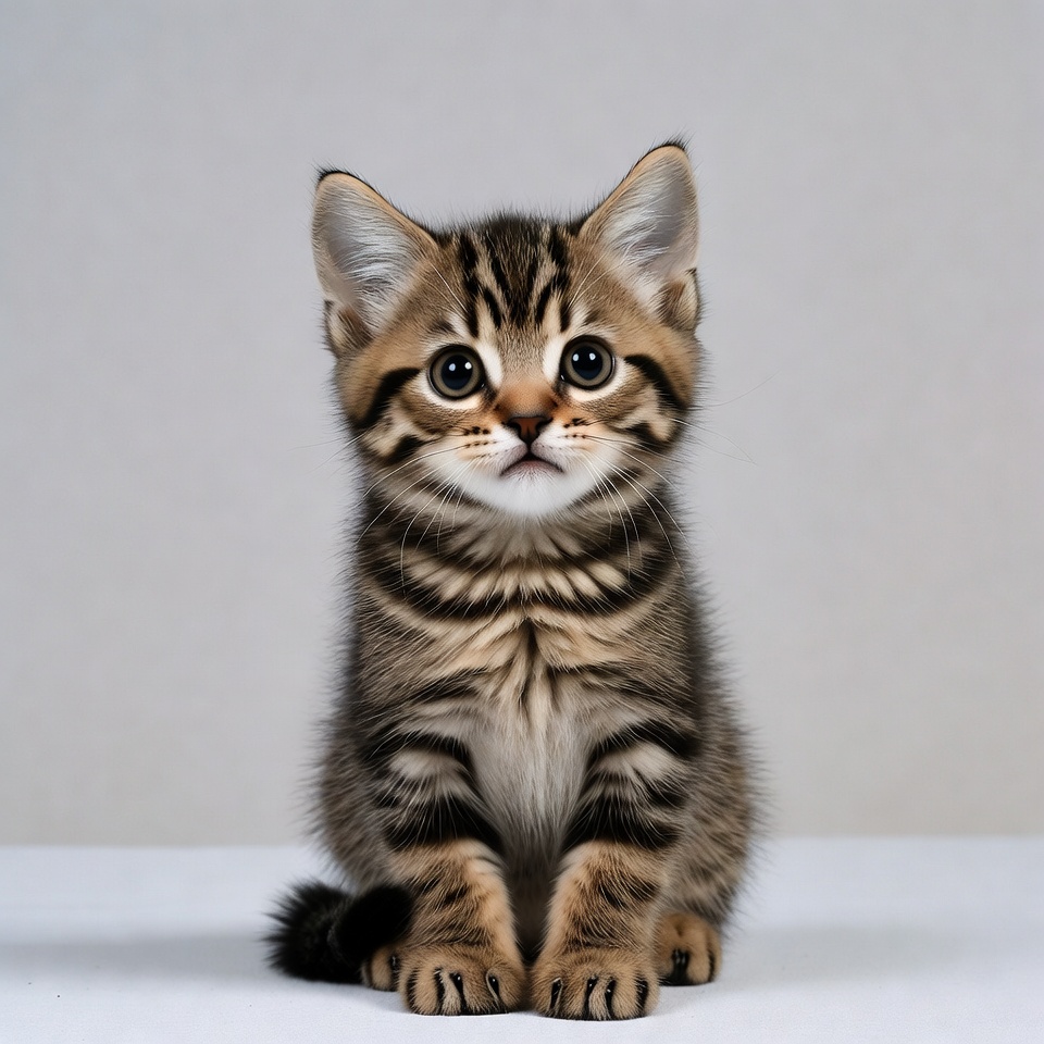 A small kitten with stripes sits on a flat surface. It looks up with wide eyes, displaying curiosity and playfulness.