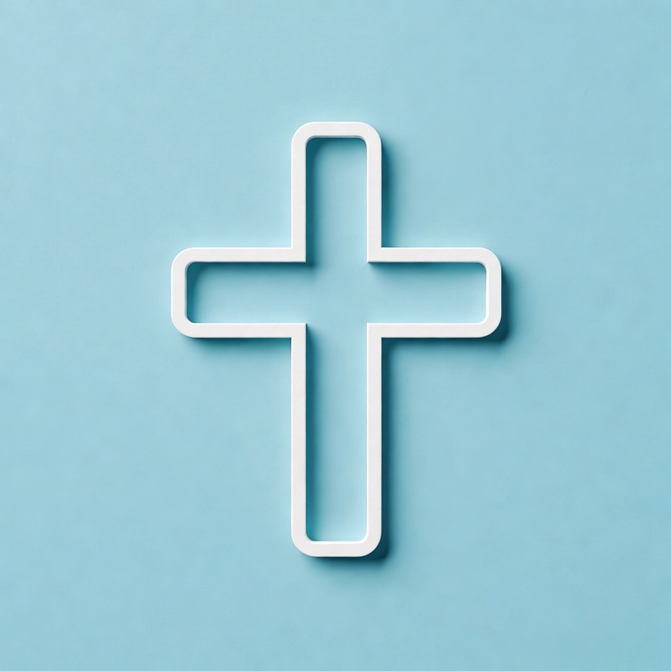 A simple white cross shape lies flat on a light blue surface. The design is minimal and highlights the contrast of the colors.
