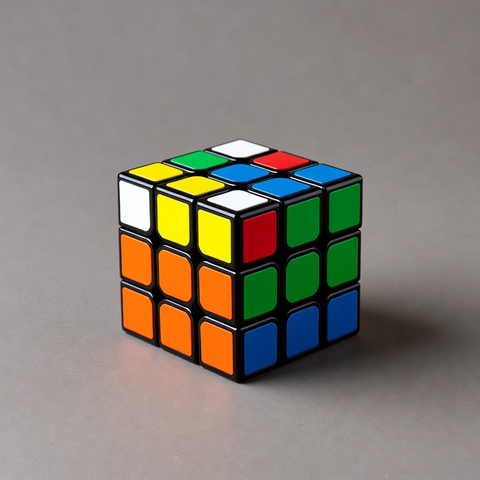 A Rubik's cube sits on a gray background. Its colorful sides show various combinations of colors and patterns.