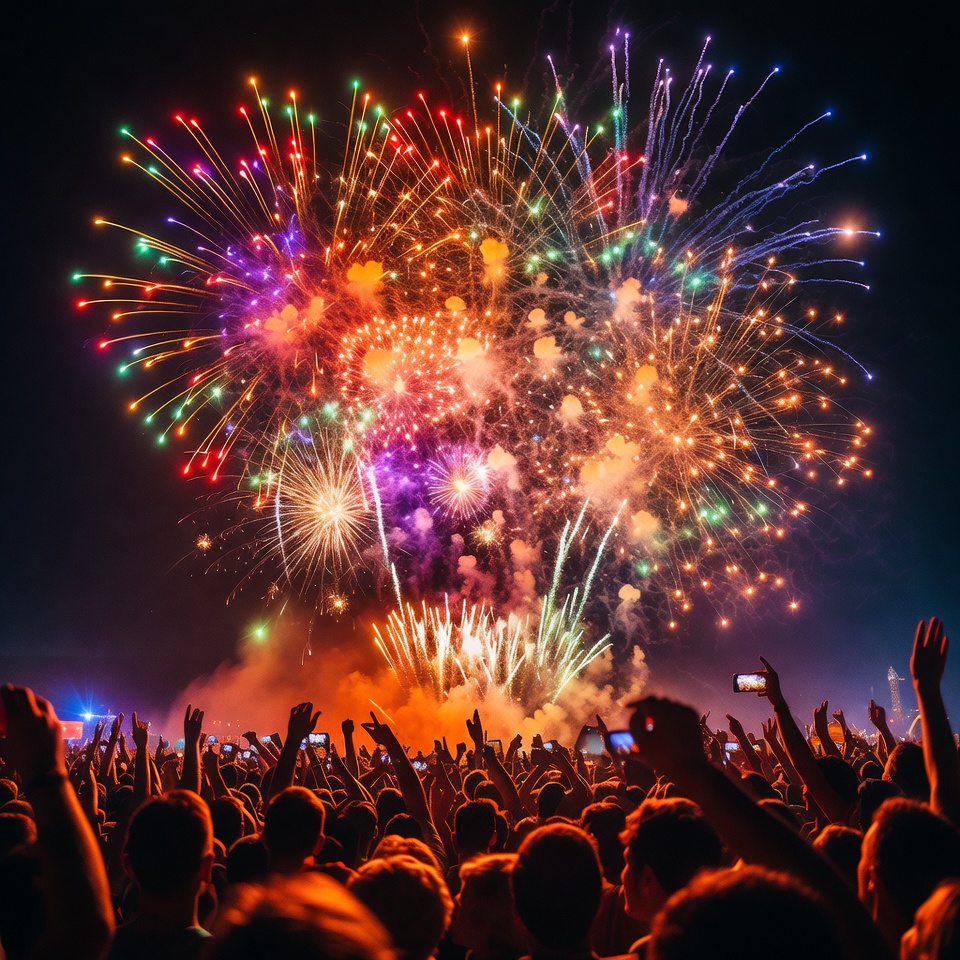 atmosphere, celebration, cheers, colors, crowd, display, event, excitement, explosions, festive, fireworks, hands, lighting, music, night, outdoor, party, people, sky, summer