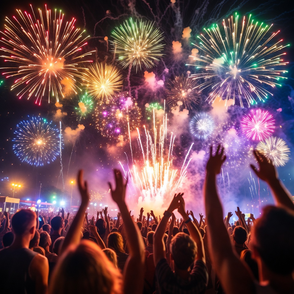 celebration, cheering, colors, crowd, display, entertainment, event, excitement, festival, fireworks, fun, gathering, joy, light, music, night, outdoor, people, sky, summer