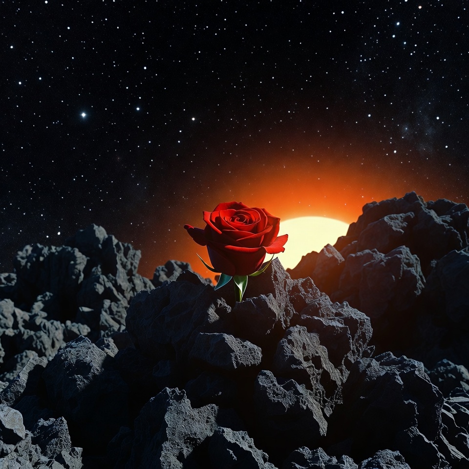 A red rose stands on dark rocks as a sunset shines in the background. Stars are visible in the sky, creating a unique cosmic view.