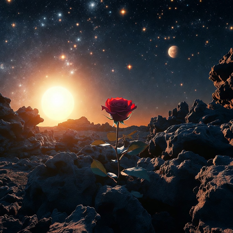 A red rose stands alone on rocky terrain under a bright sun and distant planets in the starry sky.