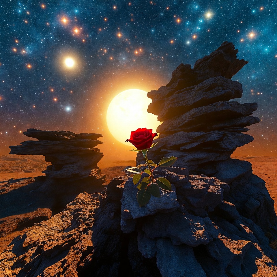 A red rose stands alone on rocky terrain with a bright starry sky and large sun in the background, creating a striking cosmic scene.