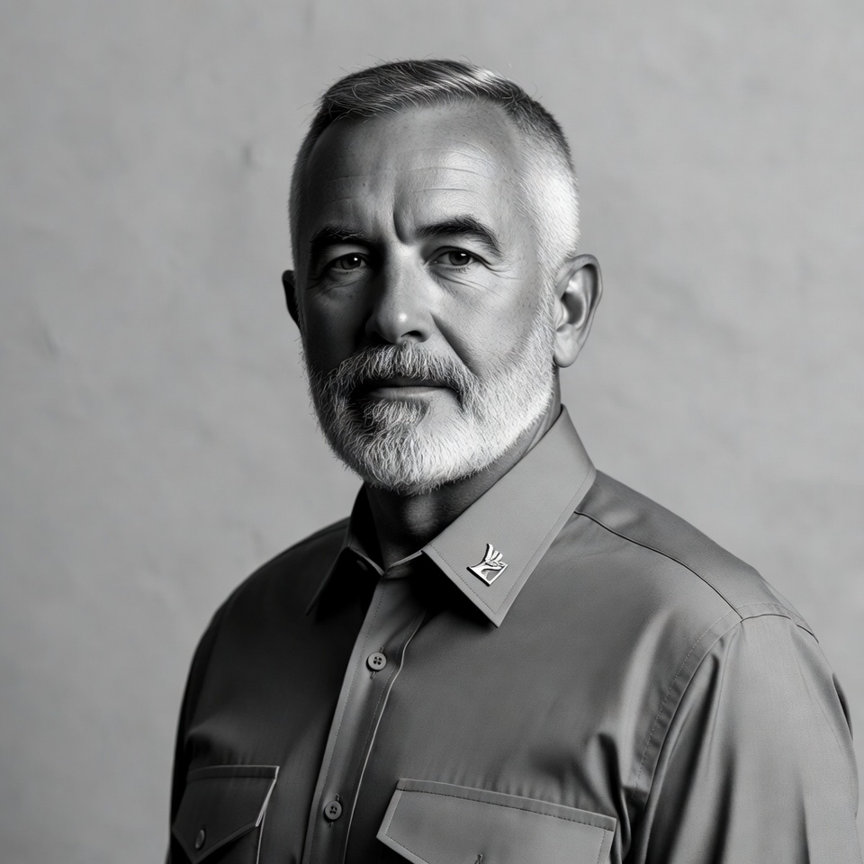A man with a gray beard stands against a plain background. He wears a button-up shirt and looks confidently toward the camera.