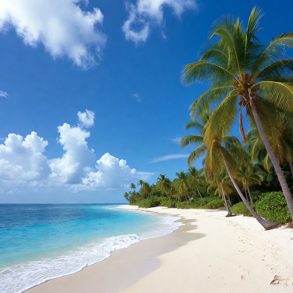 White sand beach with clear blue water and tall palm trees under a bright sky. Few clouds are visible on a sunny day by the ocean.