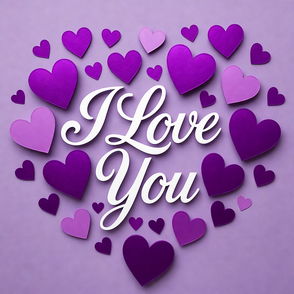 Heart shapes in purple surround the words I love you. This display shows affection and care. Perfect for romantic occasions.
