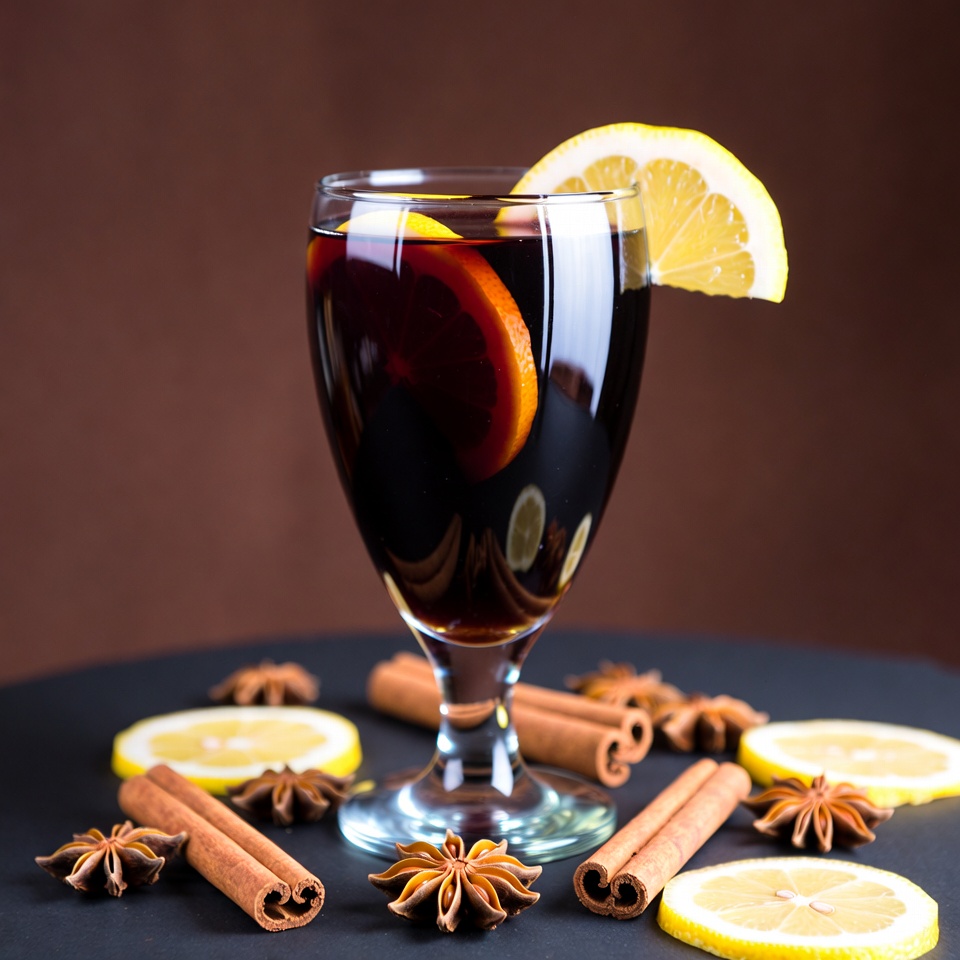 A glass of warm drink sits on a table. Slices of lemon and spices are arranged around the glass, suggesting a cozy atmosphere.