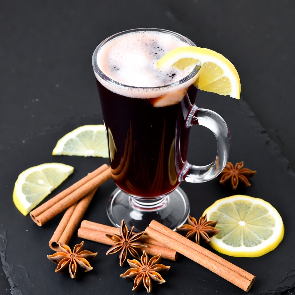 aromatic, beverage, black background, cinnamon, cocktail, cozy, culinary, drink culture, drink presentation, garnish, glass, hot drink, ingredients, lemon, party, refreshing, spices, star anise, warm drink, winter drink