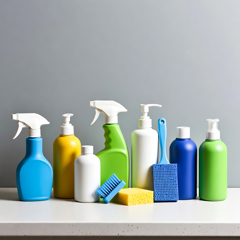 Various bottles of cleaning products and sponges arranged neatly on a countertop against a neutral wall.