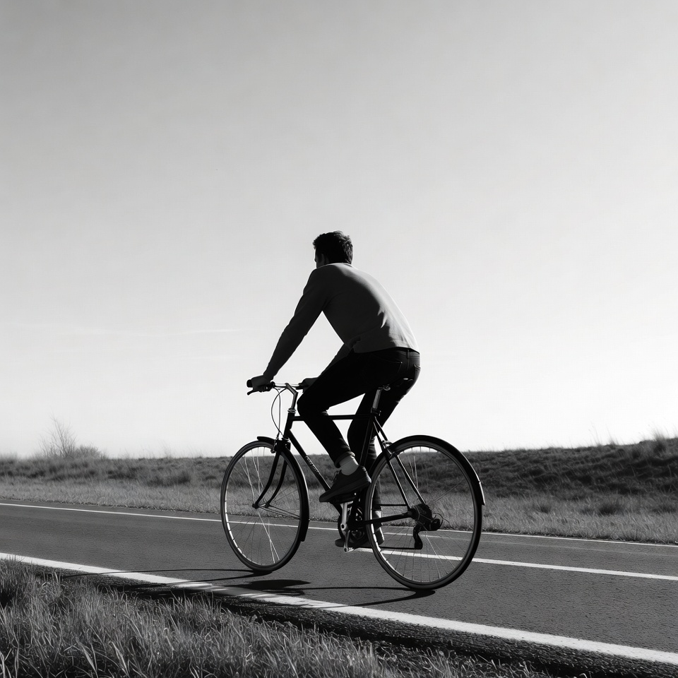A person cycles along an empty road with grass on both sides during sunset, enjoying the open space and fresh air while riding.
