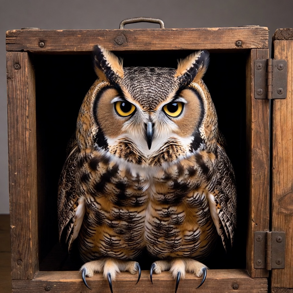 A large owl is positioned inside a wooden box. It has bright eyes and distinct feathers. The setting appears to be indoors.