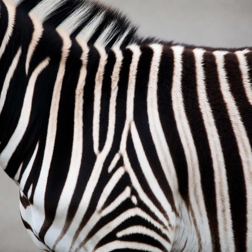 A zebra stands still, showcasing its unique black and white stripes. The animal is positioned sideways, emphasizing its pattern.