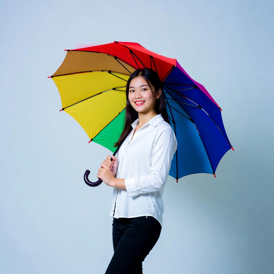 A woman stands indoors with a rainbow umbrella while wearing a white shirt and black pants. She smiles at the camera and poses confidently.